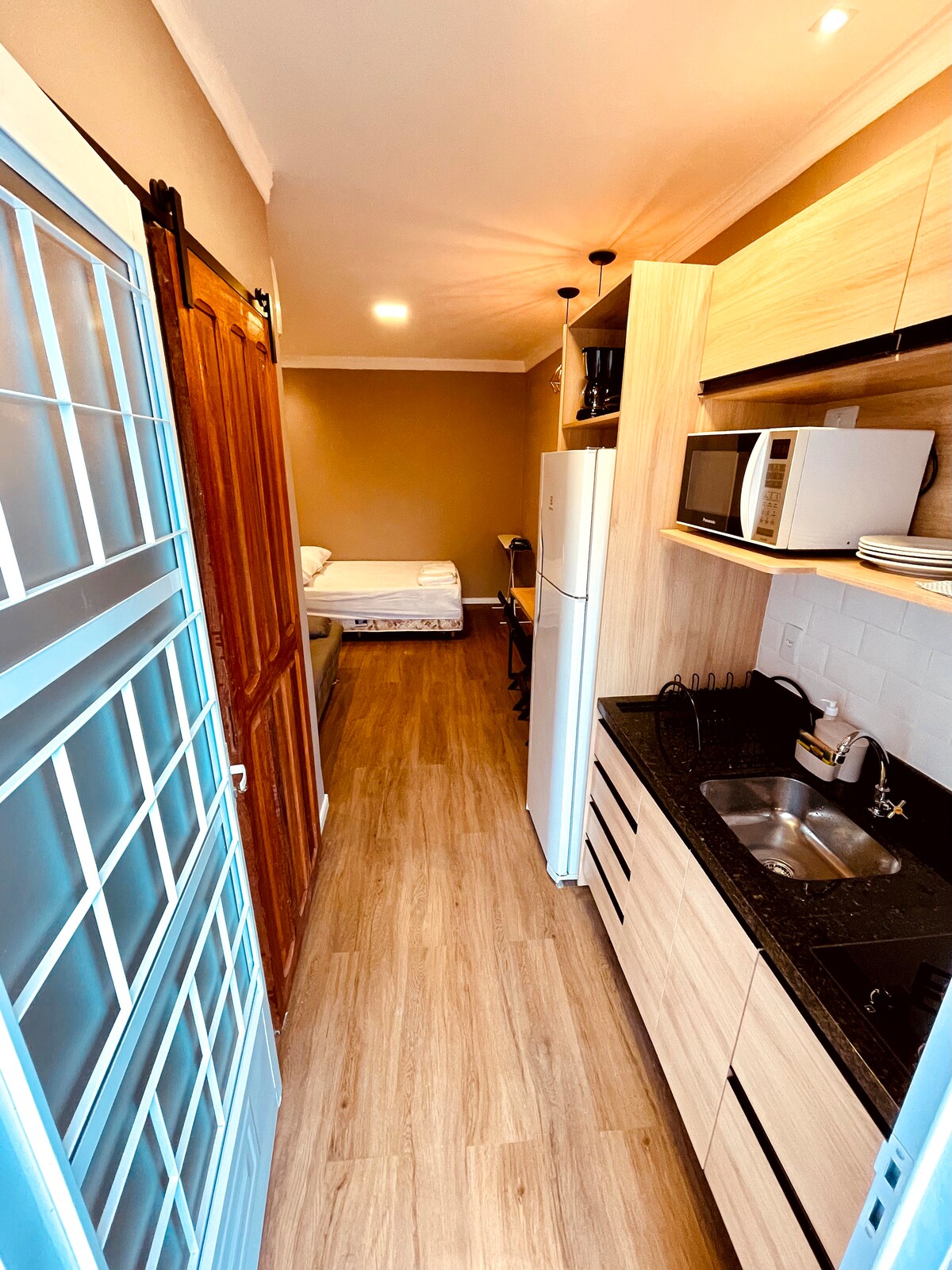 Azul, inspirador y relajante. Le invitamos a disfrutar de este estudio de 25 m² totalmente equipado, con una ubicación privilegiada en el barrio Eldorado, en una calle tranquila y segura, cerca de la Arena da Amazônia, Ponta Negra y el centro histórico y cultural de Manaus. Un espacio acogedor e íntimo, ideal para sus días de trabajo, turismo y ocio. Ofrece un ambiente tranquilo y familiar, perfecto para su estancia: - Cocina equipada - Baño - Wi-Fi - Smart TV y aire acondicionado - Cama