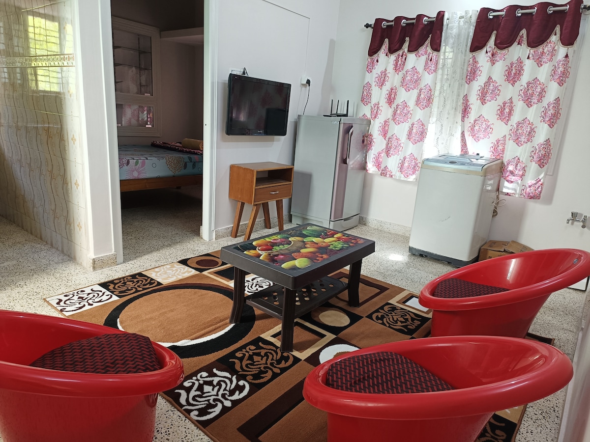 CozyNest Retreat: tu tranquila escapada 2BHK a solo 5 km de los icónicos jardines de Brindavan. Ideal para familias, amigos, parejas y trabajadores remotos. Nuestro alojamiento cuenta con: -1 cama tamaño king y 1 cama tamaño Queen con cómodas almohadas y sábanas limpias - Televisión inteligente (40pulgadas) con más de 15 aplicaciones Ott y DTH. - Wifi de alta velocidad: transmitir, trabajar o jugar sin problemas. - Cocina modular (estufa, purificador de agua Pure It). - Baño moderno con agua caliente - Entrada con cerradura inteligente: llegada a cualquier hora, sin complicaciones - CCTV y complejo cerrado, cerca de Infosys, KRS. -Refrigerador