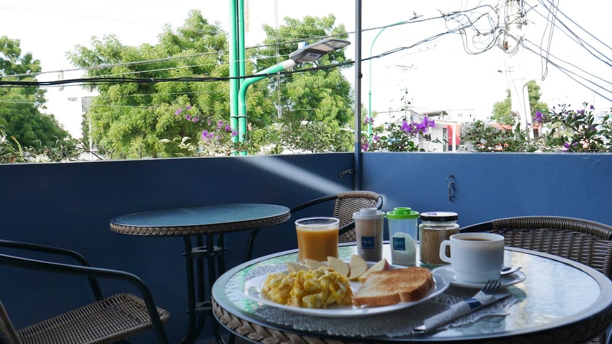 Esta mini-suite acomoda de uno a tres huéspedes, con amplitud de espacio. Tiene una cama matrimonial y una individual. Es perfecta para viajeros solos o acompañados. Esta suite es parte de un conjunto de mini suites privadas para huéspedes. Queda en el segundo piso de una casa privada, y con seguridad, convenientemente localizada en uno de los barrios premier de Manta, a pocos pasos de la zona rosa, restaurantes y bares. Y también lo suficiente residencial para proveer tranquilidad y silencio.