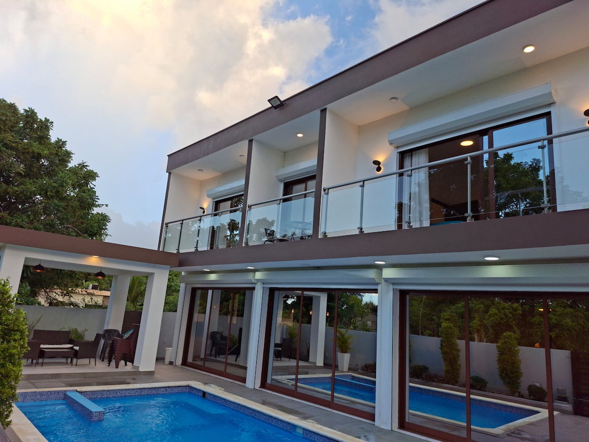 Alojamiento único, a solo 5 minutos de las playas. Espacio para que disfrutes con los tuyos. Aire acondicionado en todas las habitaciones, 8 habitaciones 8 camas grandes queen 2 pequeñas twin, 1 sofa cama tamaño twin, área de recreación, billar, dominós, piscina, Jacuzzi, y mucho espacio. Agradecidos por su elección! ✨️