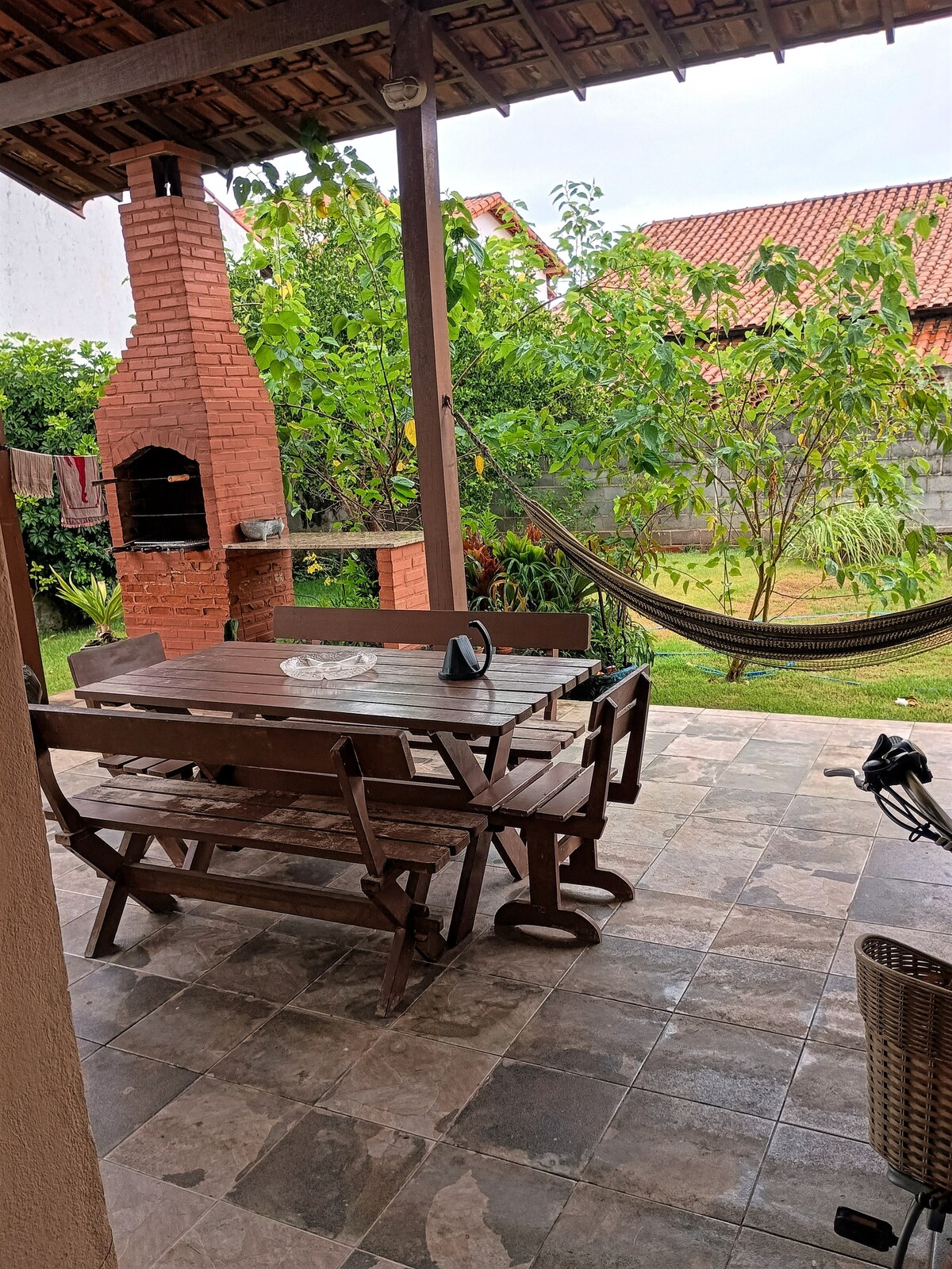 La playa Guaratiba, en Maricá/RJ, encanta con su mar tranquilo, ambiente familiar y atardeceres inolvidables.A tan solo 150 metros de la arena, esta casa ofrece el equilibrio perfecto entre comodidad y naturaleza: 3 dormitorios (1 con baño privado), una sala de estar con Smart TV, internet de alta velocidad, una cocina totalmente equipada y una zona de lavandería.En la parte delantera, una hamaca y mesas exteriores para relajarse; en la parte trasera, un patio con barbacoa y un garaje.Perfecto para días tranquilos junto al mar.