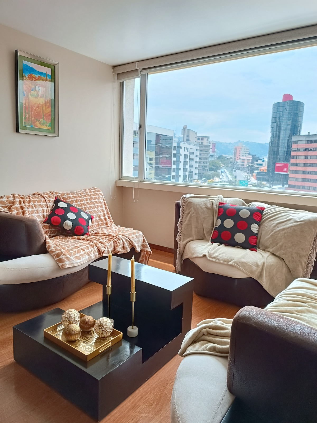 "Apartamento acogedor, luminoso, independiente en el corazón de Quito, Ideal para profesionales itinerantes, viajeros de negocios,nómadas digitales...Rodeado de una amplia oferta de restaurantes, farmacias, centros comerciales ,cerca del MetroQuito. Incluye dormitorio, baño privado, cocina equipada,sala, lavandería y gimnasio compartido, además de internet rápido y Netflix.Descuentos semanales (10%)y mensuales(20%).