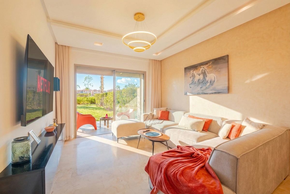 Cette sublime villa d’architecte, érigée sur un terrain de 1020 m² avec 360 m² habitables, se trouve à proximité immédiate des golfs. Elle dispose de 5 chambres et peut accueillir jusqu’à 8 personnes. Très lumineuse, elle offre de beaux volumes, notamment un grand salon avec cheminée, et bénéficie de la fibre . Vous profiterez d’un magnifique jardin luxuriant et d’une piscine XXL, entourée de plusieurs transats pour des moments de détente absolue. Piscine chauffée (supplément de 250 Dhs/jour).