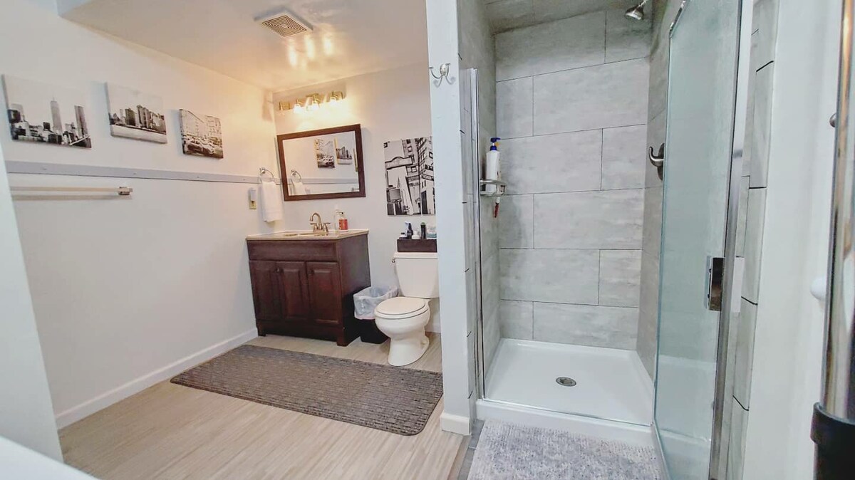 **ESTUDIO PRIVADO PARA HUÉSPEDES** Ahora aceptamos estancias largas de hasta 13 semanas. Ponte en contacto para obtener más información. Estudio privado recién remodelado de 1 dormitorio con baño y cocina americana (sin horno), suite de 450 pies cuadrados ubicada en la planta baja DENTRO de mi casa de dos niveles ubicada en un barrio residencial. La entrada y el pasillo son solo espacios compartidos. Lavandería solo para huéspedes de larga estancia. Se adapta cómodamente a 2 adultos. La cama tamaño king se convierte en 2 camas individuales tamaño XL. Se admite un perro. Por favor, avisa con antelación.