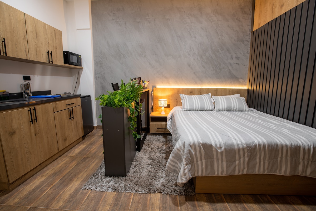 Loft 43 Medellin Increible apartaestudio Ideal para quienes disfrutan trabajar desde cualquier lugar. Cuenta con una cama Queen Size, escritorio y silla de trabajo, cocina integral dotada, baño privado con ducha de agua caliente, televisión de 43 y conexión WIFI. Los elementos básicos de cocina puedes solicitarlos en recepción, Aceite, vinagre Sal y pimienta puedes comprarlo en en una tienda cercana. Para registrarse es necesario presentar un documento de identificación fisico válido.