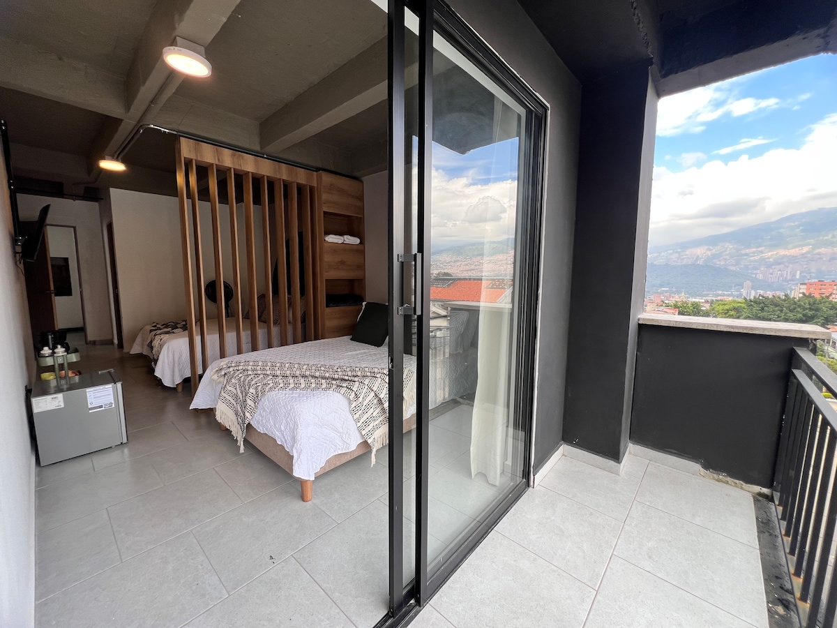 Habitación privada ideal para hasta 4 huéspedes, equipada con 2 camas dobles, baño privado, nevera y café disponible. Cuenta con balcón y una vista parcial lateral a la ciudad, perfecta para relajarse después de un día en Medellín. Espacio cómodo y funcional, ideal para familias o grupos que buscan confort y buena ubicación.