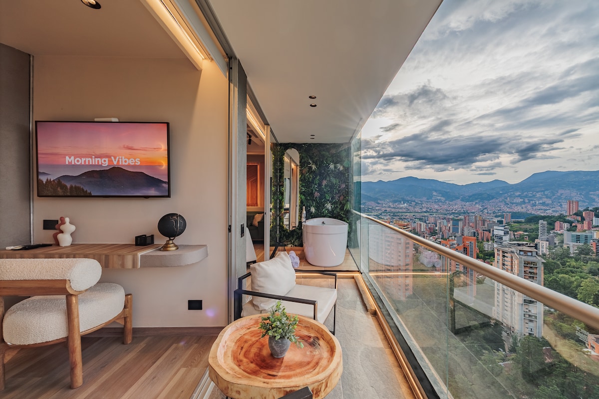 Experience Medellín from above in this luxury 1 BD apartment on the 24th floor, with premium finishes, skyline views, and total comfort. Enjoy a private Hot Tub, spacious living area, fully equipped kitchen and 5 stars amenities. -Private Hot bath tub -AC -Blackout remote control -High Speed Wi‑Fi/800MBs -Pool+Share Jacuzzi+Turkish bath -FREE in-unit washer/dryer -On-site restaurant & SPA -Full gym 24/7 -Workspace -FREE co‑working space -24/7 lobby & security -No Airbnb fees