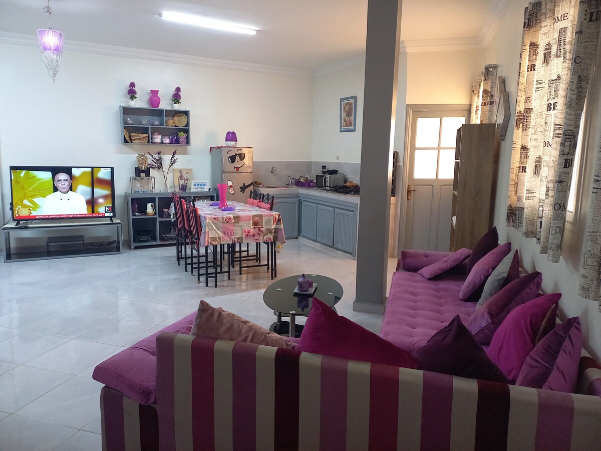 Relájese en este espacio tranquilo y elegante hermosa casa en el corazón de la ciudad el hajeb que consta de un (2)dormitorio con balcón una sala de estar una cocina abierta y bien equipada con un baño caliente,un gimnasio, una conexión Wi-Fi,un (3) smart tv,, osn+,shahid gratis y una calefacción de gas.d.,una cama para bebés d,un biraux para su trabajo d,una terraza para comer al aire libre