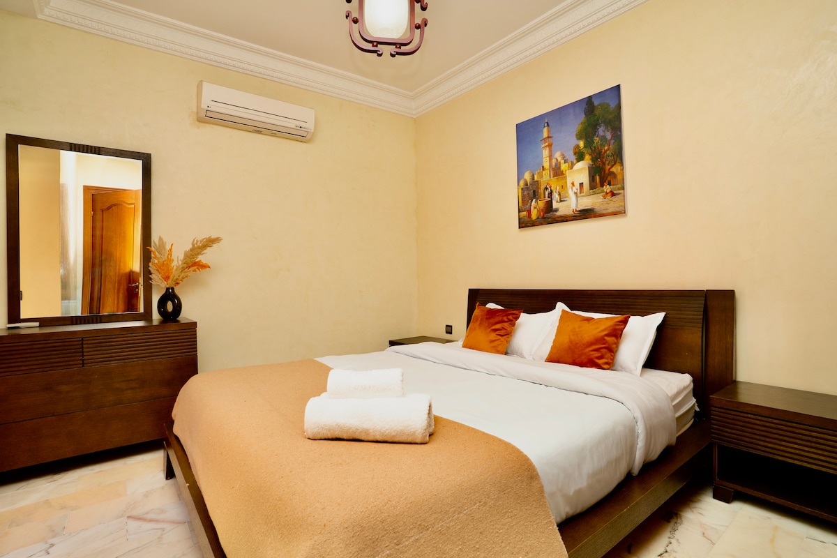 Relájese en este alojamiento tranquilo y elegante Con acceso directo a una terraza, este espacioso y climatizado apartamento consta de 2 dormitorios. También cuenta con TV de pantalla plana con servicios de streaming. Este establecimiento es para no fumadores. Se encuentra a 2 km del Museo Mouassine y a 1,3 km de la Mezquita Koutoubia. El aeropuerto se encuentra a 3 km. Se puede proporcionar un servicio de transporte al aeropuerto por un cargo adicional.