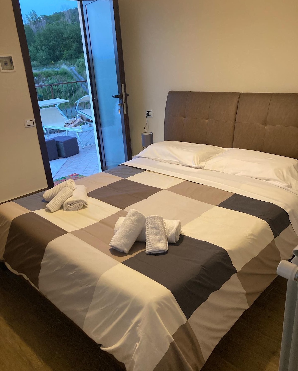 La "Corte de los Olivos" está compuesta por seis unidades independientes de varios tamaños, todas dentro de un extenso olivar privado. Te ofrecemos una habitación grande con cama matrimonial tamaño king y baño. Desde la piscina disfrutarás de la vista al mar desde el Vesubio hasta Isquia. Conectado por una antigua escalera, te encontrarás en el ferrocarril del Golfo de Circumvesuviana.