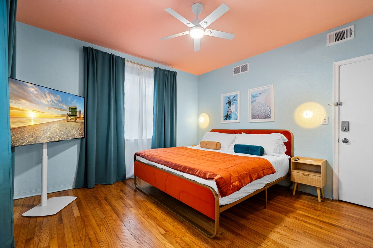 ✔ n.1 espacio para autos asignado Cocina ✔ completa con lavavajillas Patio trasero✔ privado completamente cercado con asientos ✔ SmartTV de 50 pulgadas ✔ Cama tamaño king con colchón de 20" ✔ Cama doble con colchón de 20" ✔ * Unidad de esquina *, ventanas dobles, mucha luz ✔ Wifi de alta velocidad ✔ Lavadora y secadora en las instalaciones (de pago, solicítalo) ✔ Se admiten mascotas Terraza del✔ condominio con asientos y tumbonas. ✔ Puntuación de accesibilidad: 96 Este es un impresionante estudio con patio trasero privado totalmente vallado en un histórico exboutique-hotel Art-Déco, a 1 cuadra de la playa.