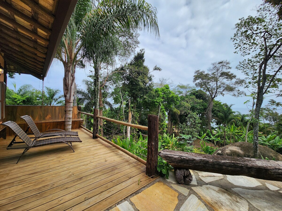 Un bungalow construido artísticamente en cada detalle... bañera abierta al bosque con techo de cristal dan la sensación de estar inmerso en la naturaleza, con una higuera centenaria al frente y muchas aves... íntimo y acogedor en conexión con la Naturaleza en contacto con esta zona de reserva de la Mata Atlántica. La otra ducha de hidromasaje está en la terraza abierta al bosque y es deliciosa de día o de noche con cielo estrellado y luna.