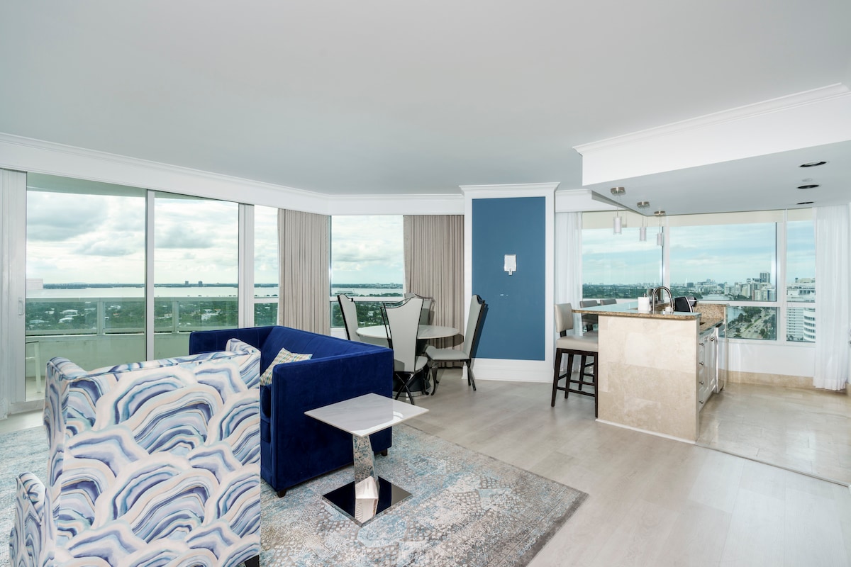 La suite de esquina de un dormitorio está ubicada en el lujoso condominio Tresor Tower del Hotel Fontainebleau. Esta amplia suite de aproximadamente 1066 pies cuadrados de un dormitorio y dos baños completos ofrece un balcón completamente amueblado con magníficas vistas panorámicas envolventes de la bahía, el centro de Miami y el océano. El dormitorio principal privado ofrece una amplia cama tamaño king y 32 TV LCD de alta definición. La cocina de tamaño completo ofrece los electrodomésticos incluyendo una lavadora/secadora de tamaño completo, microonda, refrigerador y cafetera.