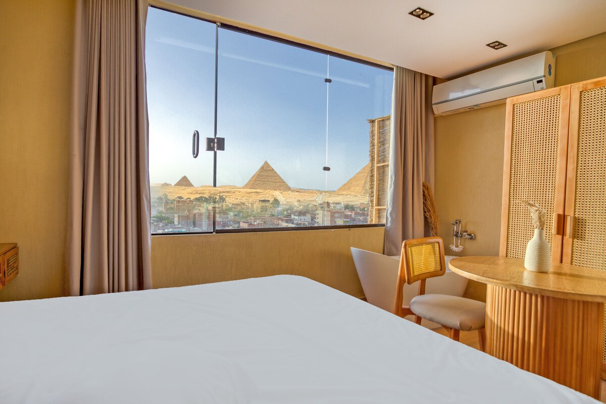 Sí, las fotos son 100 % reales. Disfruta de tu estancia con una cama tamaño king con vistas panorámicas a las pirámides y la esfinge. El estudio incluye bañera, baño privado, mesa de comedor, cocina pequeña y mucho más.