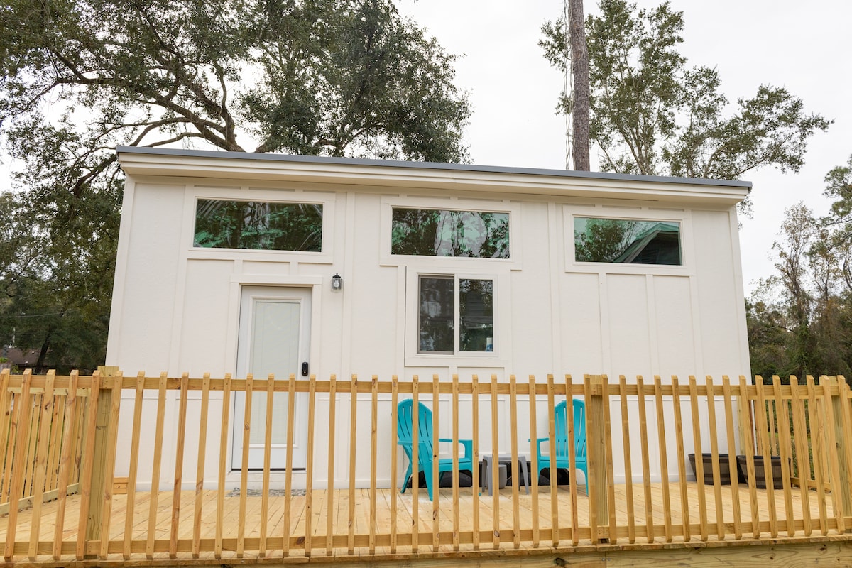 Reconnect with nature at this unforgettable escape. The “Tucked Away Tiny” is a tiny home with HUGE style! It is located in the country woods of Milton, FL on family-owned farm land, but not too far off the beaten path. Only 15 minutes to the heart of the city, and 45 minutes to beaches. It is next door to Sowell Farms which is home to several wedding venues, fenced exotic wildlife (may or may not be seen during your stay), and home of the Trophy for Great American Christmas Light Fight!