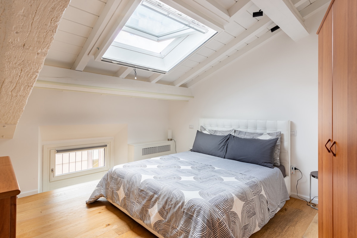 Apartamento de dos habitaciones recientemente reformado de unos 50 metros cuadrados, en el interior de un edificio de la Via Corridoni de los años 50, a pocos pasos del corazón de la ciudad y de los principales monumentos. Romántico y tranquilo, amueblado en estilo moderno, dispone de entrada, baño con lavadora, trastero, espacio abierto con cocina americana, sofá, TV, cama doble en altillo con vigas de madera a la vista y una bonita claraboya.