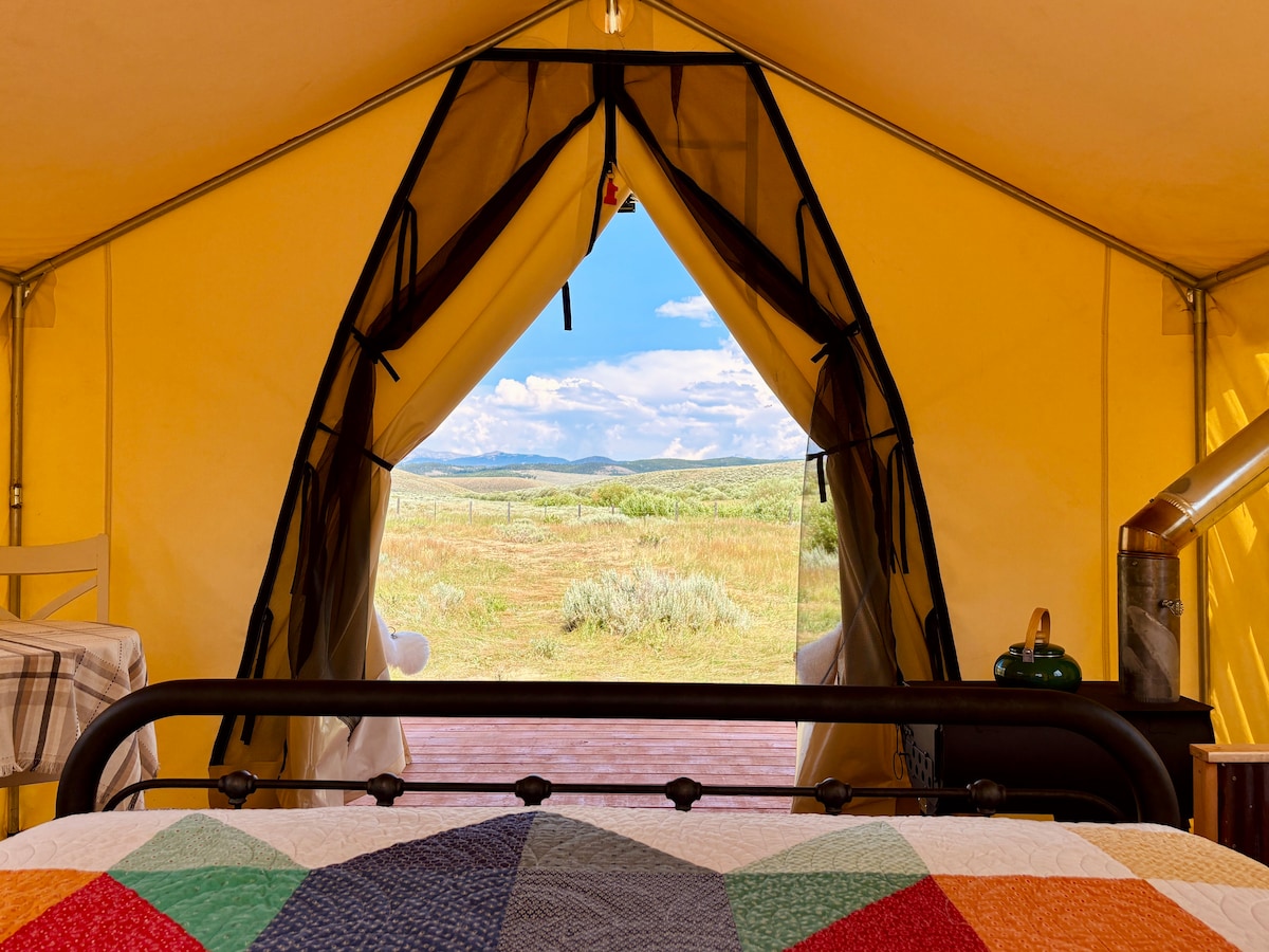 Te damos la bienvenida a la tienda de campaña Palisade en Gateway Glamping. Nuestra propiedad es la más adecuada para adultos, así que deja a tus hijos y mascotas en casa. Tu tienda de campaña está completamente amueblada con una cama tamaño king, lujosas sábanas y espacio privado para comer/cocinar al aire libre con parrilla y cocina de campamento + una chimenea. Disfruta de acceso a la piscina de vaqueros, al salón comunitario y a la casa de baños compartida, todo perfecto para tu campamento base mientras exploras el cañón de Colorado.