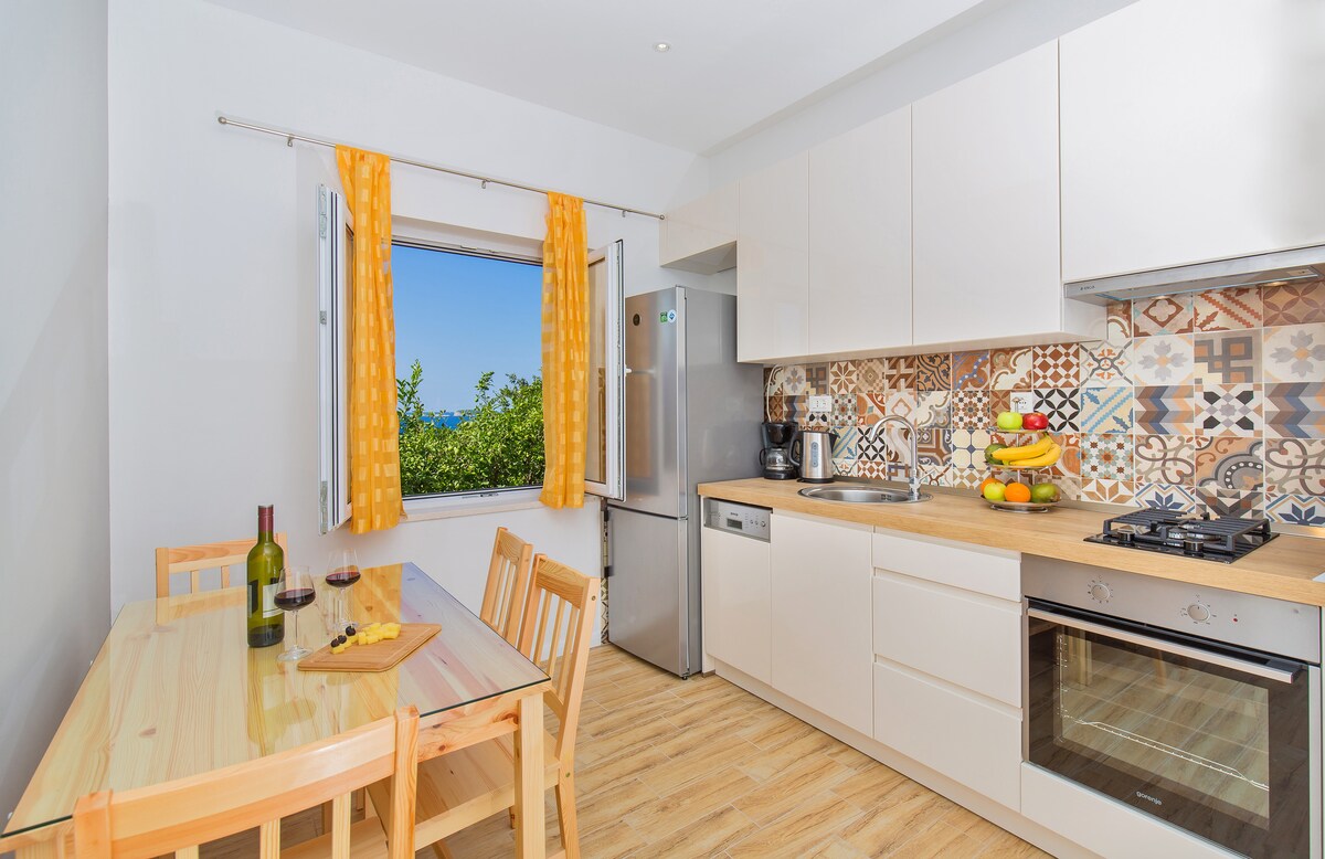 Ubicado en la encantadora villa, este apartamento elegantemente amueblado cuenta con tres dormitorios, dos baños, una enorme terraza con jacuzzi exterior, una cocina totalmente equipada (lavadora, microondas, tostadora, cafetera, hervidor de agua), comedor y zona de estar. La propiedad cuenta con unas magníficas vistas al mar Adriático y a las islas. Aire acondicionado en todo el apartamento. Wifi gratis y artículos de tocador.