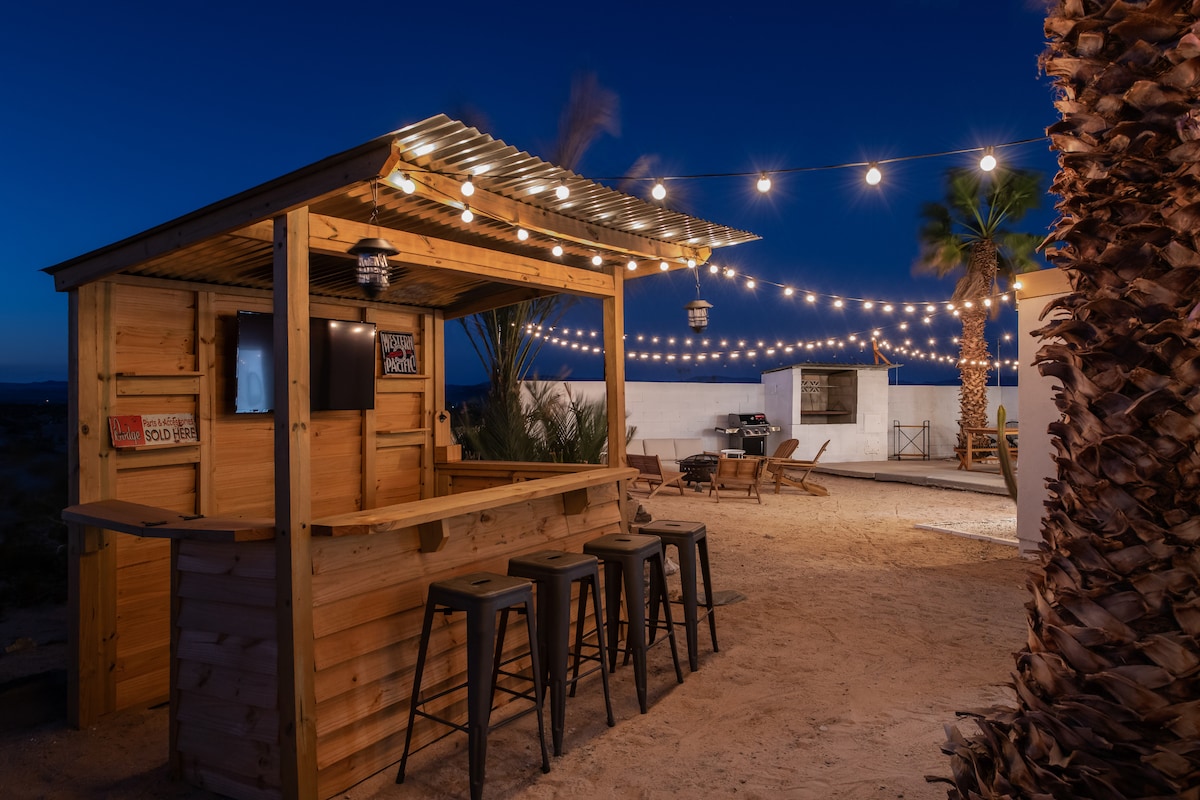 Soledad: alojamiento actualizado en un complejo privado de 5 acres ¡A 10 minutos de la entrada oeste del parque nacional JT! cúpula de observación de estrellas para una noche interminable con calentador la mejor observación de estrellas servicios con vistas a la montaña de 360 grados patio trasero/luces de cuerda estilo resort chimenea Piscina y jacuzzi bar taberna con televisión campo de golf con 2 hoyos/3 colchonetas de 60 y 80 yardas cine al aire libre 4 hamacas. ducha exterior ping pong Dos BARBACOAS 15-20 minutos a Joshua Tree. Estás lo suficientemente cerca como para explorar toda la zona, pero puedes retirarte a la soledad
