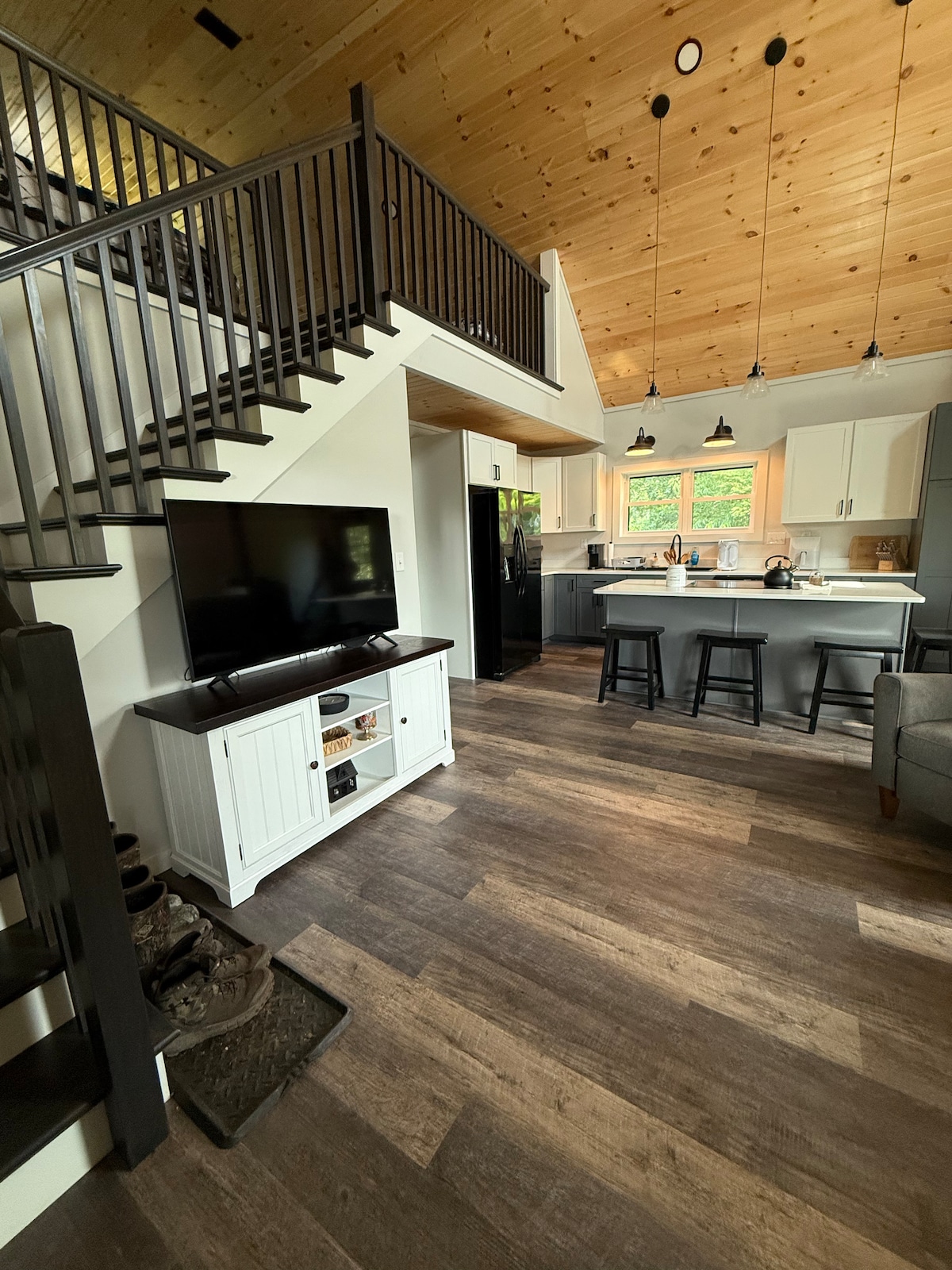 1 full bathroom with a shower. The loft area and has 2 full-size beds, flat-screen TV. The kitchen has a table for 4, refrigerator, gas stove top, microwave, and coffee pot& keurig. Guests can chill out in the cozy living area & enjoy the 50” TV over the new gas fireplace. Outside, guests can spend some quality time on the covered porch while gazing at the starry night sky.