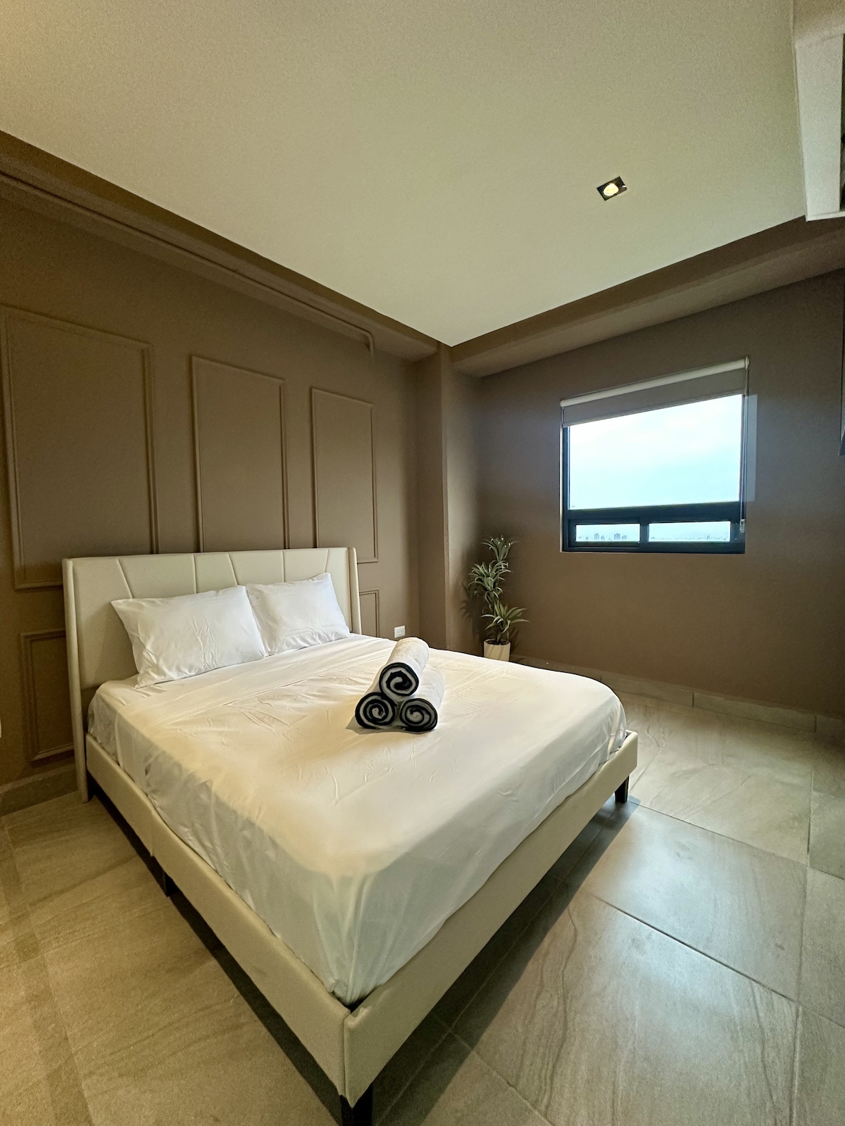 Bienvenido a nuestra master suite, moderna y elegante en una ubicación privilegiada. Esta suite ha sido diseñada pensando en tu comodidad, con una cama King size y una amplia sala de estar para que puedas relajarte como en casa. La suite ha sido cuidadosamente decorada para ofrecerte una experiencia de lujo y confort. Todo está impecablemente limpio y listo para que disfrutes de tu estancia. La ubicación es perfecta, cerca de los mejores restaurantes, tiendas y centros médicos.