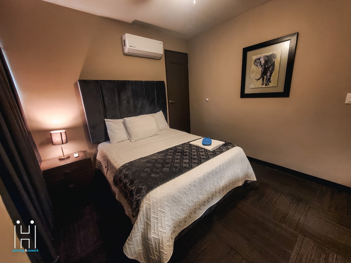 Relájate en esta habitación diseñada para ofrecer comodidad y estilo. Equipada con una cama matrimonial para un descanso reparador, un escritorio ideal para trabajo o lectura, y un baño privado que asegura privacidad y confort. Además, cuenta con una TV para tu entretenimiento y un mini split para que disfrutes de la temperatura perfecta durante toda tu estadía. Ubicada cerca del centro de Monterrey, esta habitación es ideal para quienes buscan comodidad y funcionalidad en un espacio acogedor.