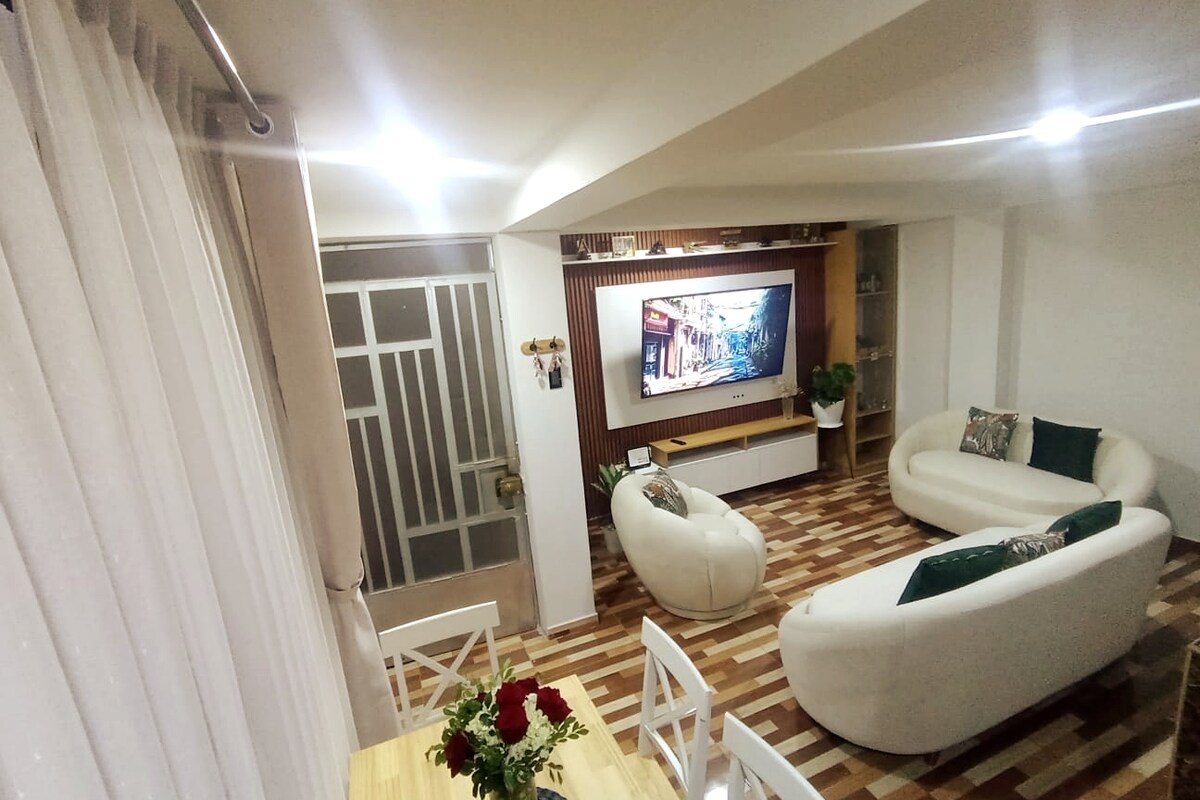"Diviértete con toda la familia en este alojamiento con estilo, ubicado en el corazón de La Merced. Disfruta de la naturaleza y la comodidad en nuestro departamento moderno y acogedor. Características: - 2/3 dormitorios con camas cómodas - 1 baños - Sala, Comedor y Balcón - Electrodomésticos - Sala de estar con TV - Con vista a la montaña - Ubicación céntrica, cerca de restaurantes y lugares turísticos Servicios: - Asistencia turística y recomendaciones -Recojo desde el Terminal