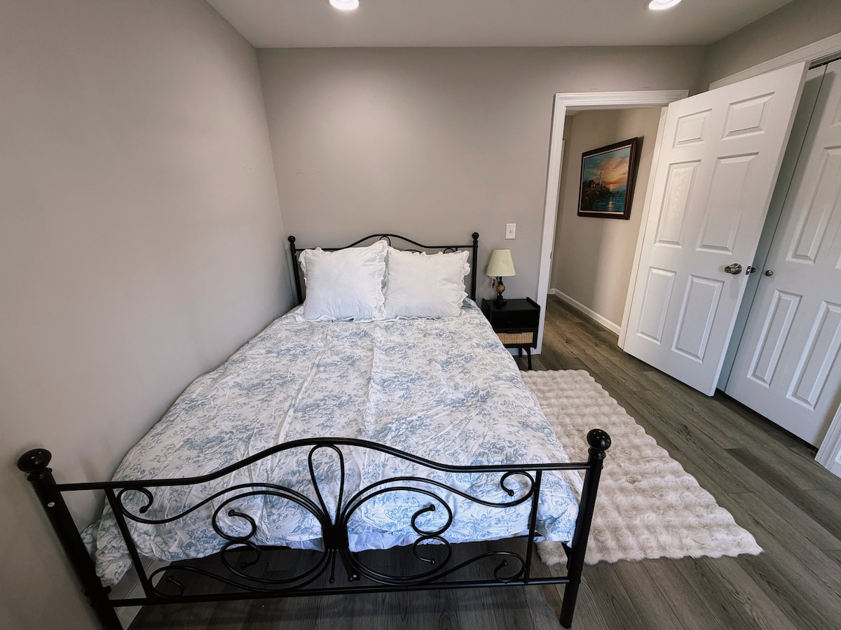 Hermoso y acogedor dormitorio con una cama tamaño king y TV. Baño de invitados de tamaño completo con lavabos para él y para ella. La casa tiene piscina, está en un vecindario tranquilo y a 1 minuto a pie del pintoresco lago Parsippany. Los huéspedes pueden usar el comedor, la sala de estar, la sala de televisión, la cocina y la piscina.