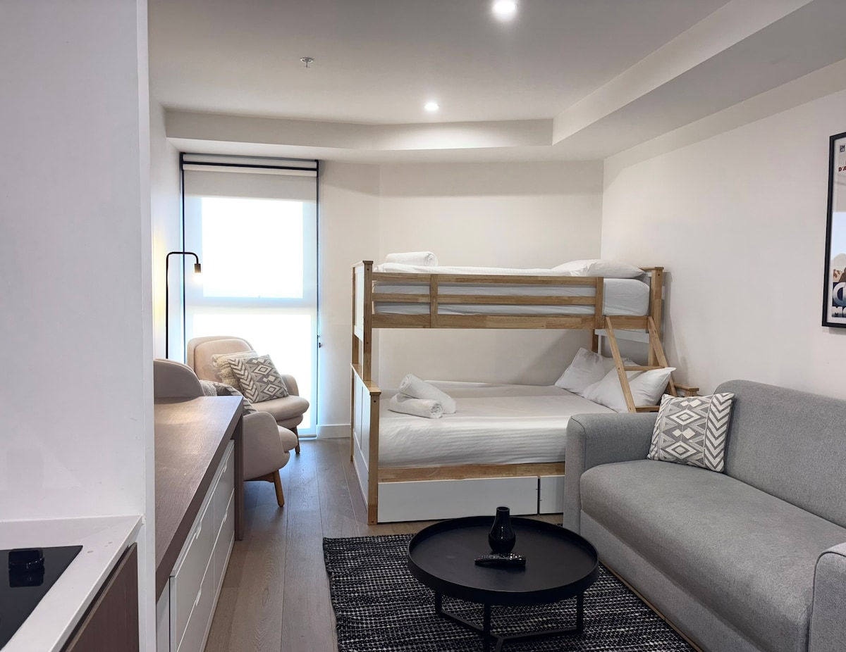 Haz que esquiar sea fácil con un moderno apartamento familiar con acceso directo a las pistas de esquí en Bourke St. Arlberg está justo al lado y abierto todo el año para tomar café y comidas, así como alquiler de esquís en invierno. La escuela de esquí está a solo dos minutos de la colina y puedes trabajar desde casa o disfrutar de una bebida en el balcón y ver a tus hijos esquiar. Dormitorio principal con cama tamaño queen más una habitación con literas con capacidad para 6 personas con literas dobles más dos camas nido extraíbles.