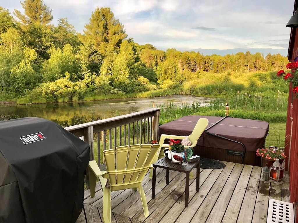Luminosa, aislada, suite de una habitación en el segundo piso con baño privado con vistas a Mill River y al otro lado de un puente cubierto. No hay vecinos visibles, pero está cerca de la ciudad. Pesca con mosca en el patio trasero, siéntate alrededor del pozo de fuego, disfruta del follaje de otoño y haz senderismo y esquí. Muy cerca del puente colgante y del sendero largo de los Apalaches. Cerca de tres estaciones de esquí: Killington, Okemo y Pico. Los perros son bienvenidos y queridos, con mucho espacio para correr. Cómoda cama tamaño queen y sofá.