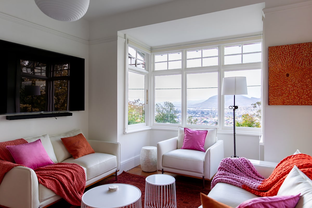 Seaview es una casa de tres dormitorios reformada con una extensión de diseño arquitectónico en el centro de Hobart. La casa es amplia y está rodeada de terrazas. Cuenta con unas vistas impresionantes al monte Wellington, a la ciudad de Hobart y más allá, al río Derwent. Se encuentra a siete minutos en coche del paseo marítimo, Salamanca o North Hobart. Seaview ha sido cuidadosamente diseñada con una mezcla de muebles antiguos y modernos para combinar la casa de la federación y la extensión de inspiración japonesa. Es una propiedad única.
