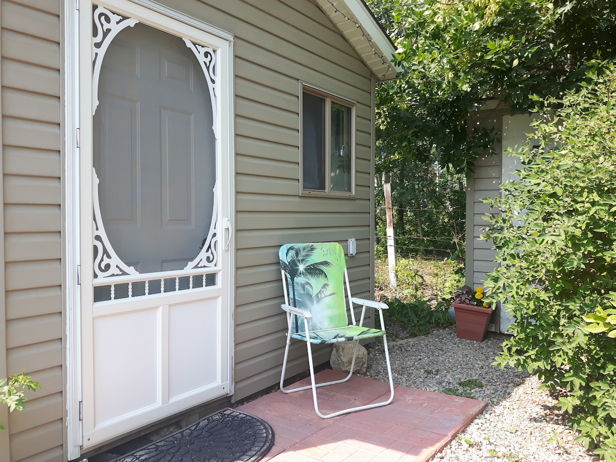 Acogedora y luminosa suite en el sótano. Relájate y recarga energías en esta acogedora y luminosa suite en el sótano con acceso a un impresionante patio trasero. Cena al aire libre en la terraza para comer o relájate en la plataforma de descanso junto a la fogata de propano. Red Deer River está a solo cinco minutos a pie a través de senderos panorámicos a los que se puede acceder directamente desde el patio trasero. Disfruta del encanto tranquilo del país con un espacio verde adicional que da al barranco del río. El propano para el fogón está disponible por un cargo adicional, o puedes traer el tuyo.