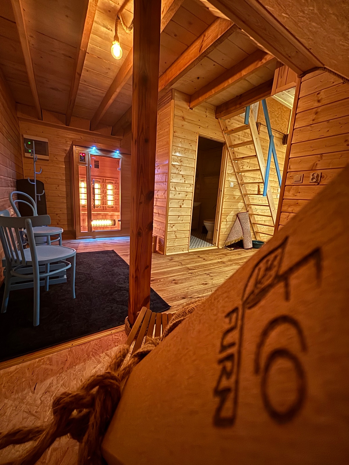 Ihr wohnt in einem freistehenden Holzhaus separiert vom übrigen Hof. Natur pur. Von der Terasse habt ihr einen großartigen Fernblick auf die hügelige Wiesenlandschaft. Dort genießt Ihr auch die Sonnenuntergänge. Zum Hofbereich sind es 25 m, dort könnt Ihr auch den Wintergarten und die Bar sowie die Seeterasse nutzen. Beheizt wird das Haus mit einem Kaminofen, der durch Luftzüge auch die obere Etage versorgt. Dafür müsst Ihr Euch um die Befeuerung kümmern.