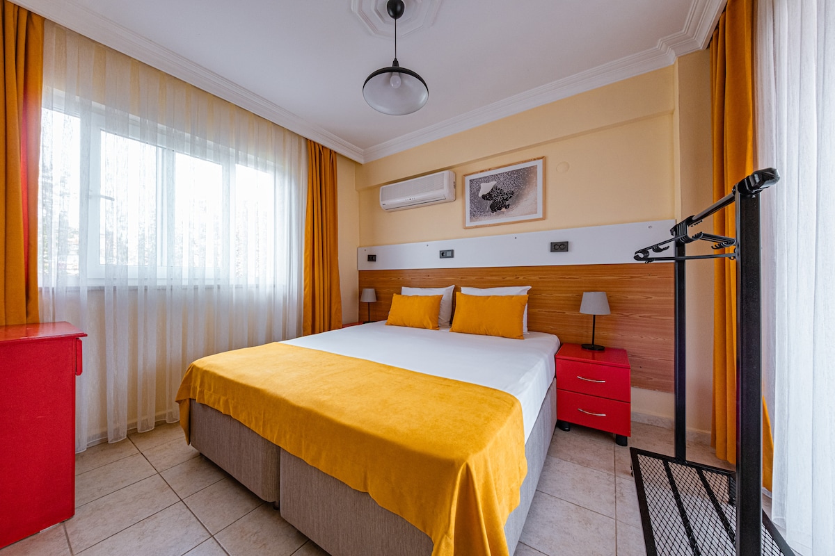 Our Superior apartment with a capacity of 4 people has a large area of 50 m2. It includes 1 bedroom and 1 living room. There is 1 double bed in the bedroom and 1 more double bed that opens from the wall in the living room. It offers you the pleasure of a comfortable stay with its fully equipped kitchen that allows you to cook in it. With its large terrace, you can sip your coffee accompanied by the insatiable beauty of Marmaris landscape.