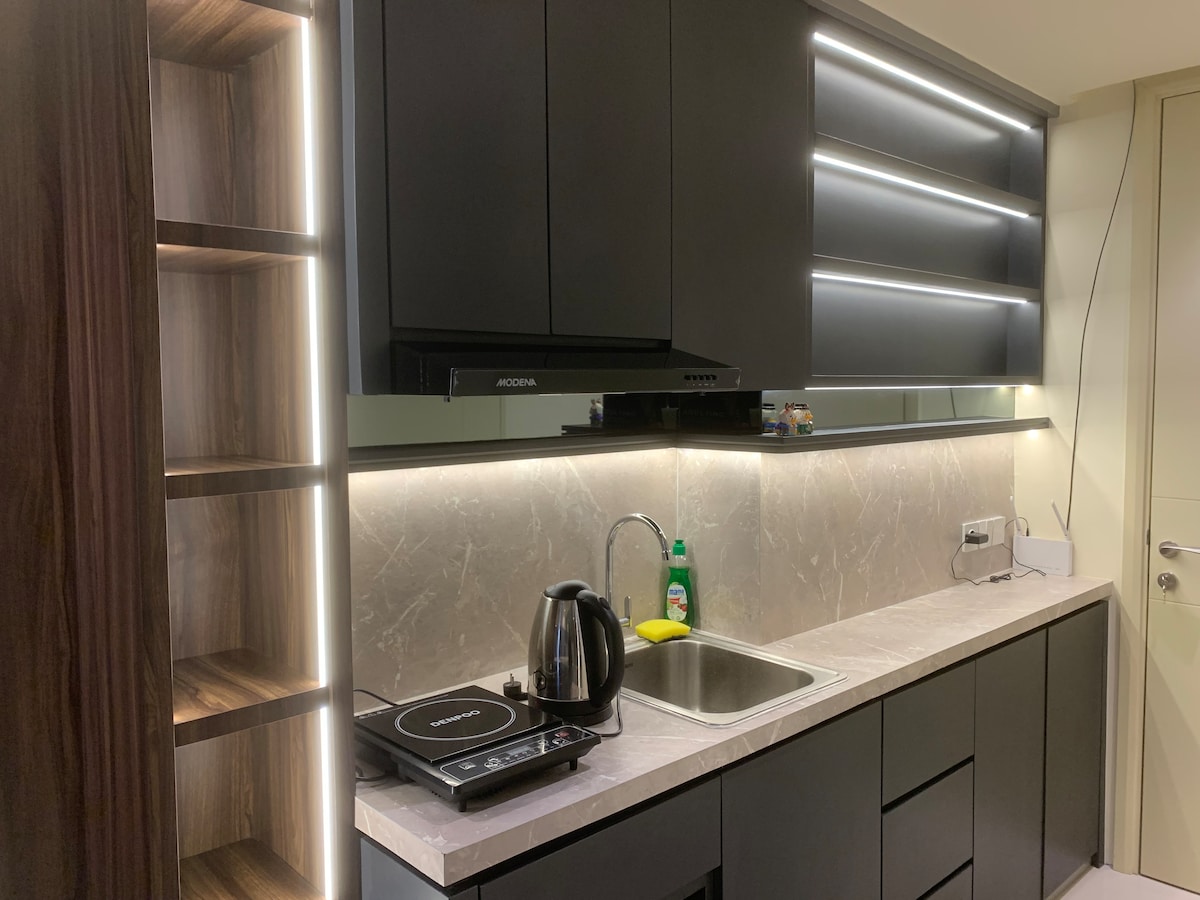 Nuestro estudio está ubicado en el apartamento Amor justo encima del centro comercial Pakuwon City. Disfruta de este tranquilo y moderno estudio con impresionantes vistas a la piscina infinita. Diseñado con un ambiente gris y plateado relajante, es perfecto para vacaciones, viajes de negocios y estancias cortas o largas. Con gran seguridad y una amplia selección de lugares para comer con una variedad de variaciones, tu estadía será más agradable mientras estés en Surabaya.