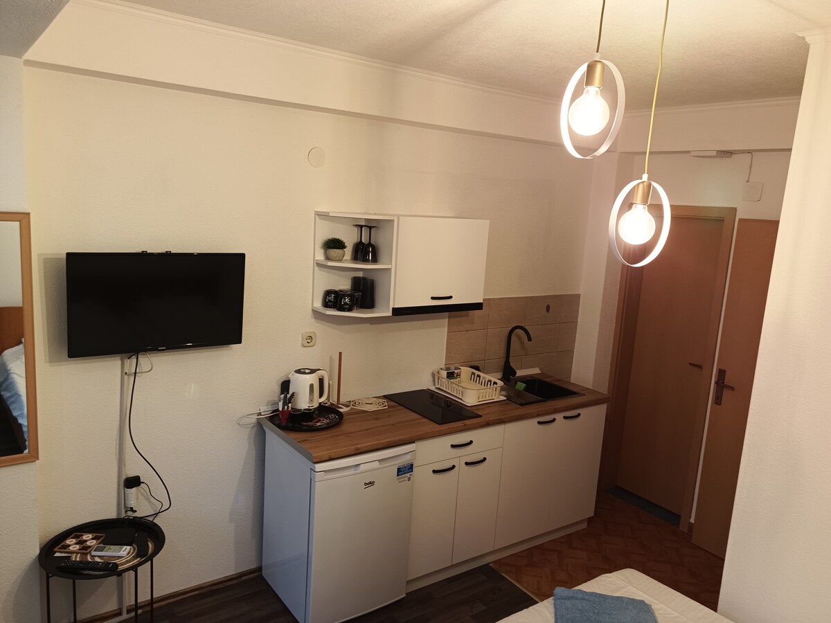 Este departamento grande y cómodo está ubicado en el primer piso. Cuenta con un dormitorio separado con una cama tamaño king y un sofá cama en la sala de estar . Para mayor comodidad, también hay una cama individual plegable opcional que se puede utilizar si es necesario. Los huéspedes tienen acceso a una cocina privada, un baño y un balcón. El apartamento está a solo 40 metros del lago Ohrid, situado en la zona semicentral de la ciudad, a solo 7 minutos a pie de la plaza principal y del casco antiguo.