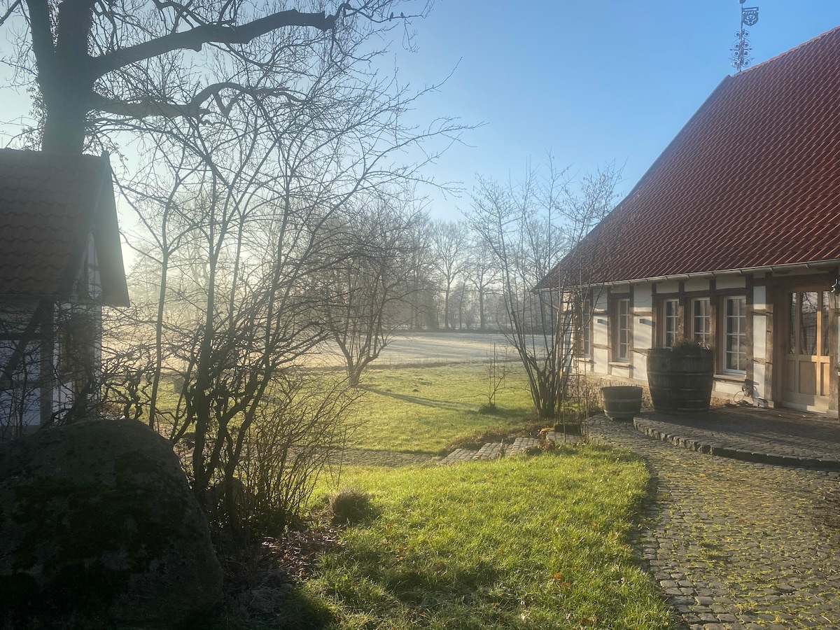 Este tipo de casa se conoce como «ein Heuerhaus». Fue construida en 1883 y es una de las pocas casas de este tipo que quedan en la zona. La renovamos a finales de la década de 1980 y está reconocida como Monumento Nacional. El área que convertimos en el apartamento para nuestros huéspedes, fue utilizada originalmente para almacenar el heno y la paja para el forraje de invierno de los animales. La casa está rodeada por un gran jardín y vistas ininterrumpidas al campo.