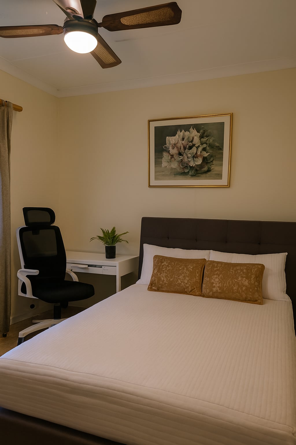 Send the kids downstairs to their own play area and bathroom, as you relax upstairs with the view of the sunset from the balcony. Enjoy four TVs with Netflix & free-to-air TV in the comfort of air conditioning. Three queen-size beds (one in each bedroom) and two single-size beds. Socialise with your family or holiday companions on our backyard table. Supermarket, bakery, bottle shop, pharmacy, club are only 400 metres away. Strictly no pets allowed. We cannot provide a tax invoice/receipt.