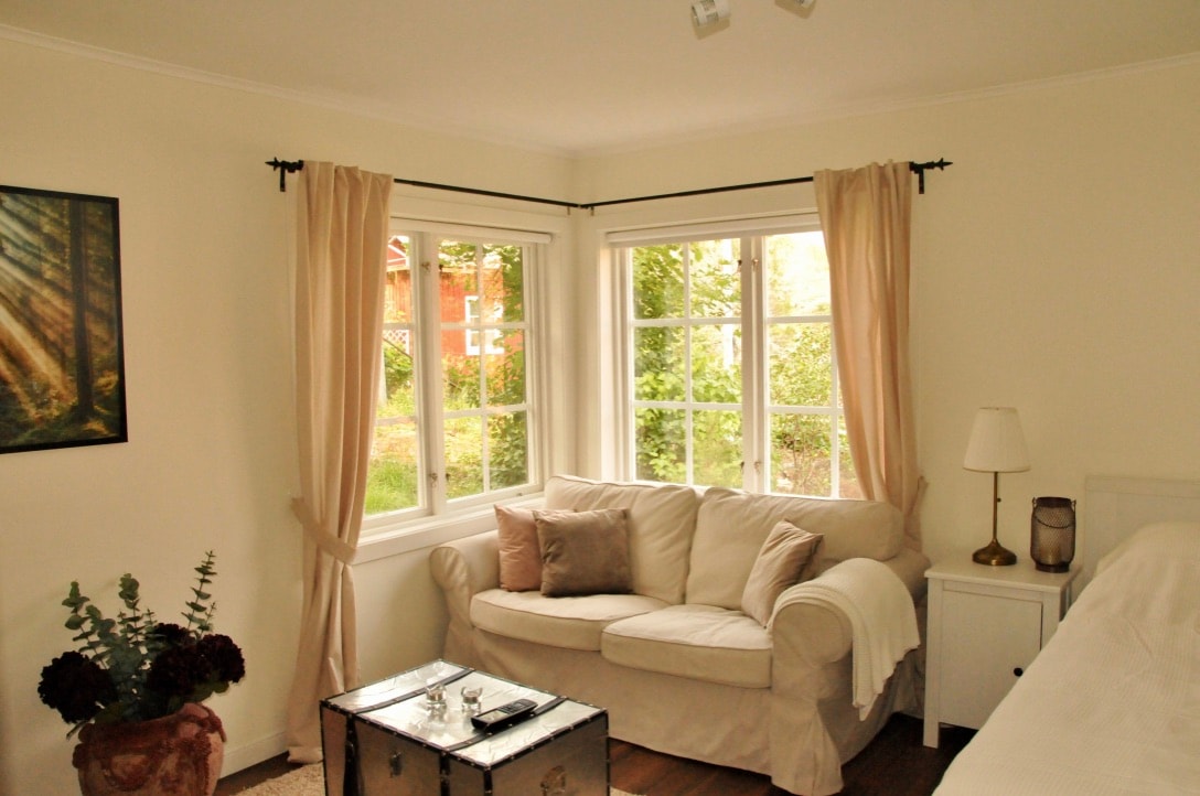Encantadora cabaña con capacidad para seis personas. Ten en cuenta que es una cabaña bastante pequeña y no una casa, por lo que si sois seis adultos y no estáis acostumbrados a las cabañas escandinavas, puede parecer un poco estrecha. Inodoro en la cabaña y acceso a una ducha/sauna en un edificio adyacente y un cenador en el jardín. La cabaña fue completamente redecorada y se instaló una nueva cocina en septiembre de 2019. La mayoría de los muebles son de 2016. Es posible llegar en transporte público, pero es aún mejor si tienes acceso a un coche.