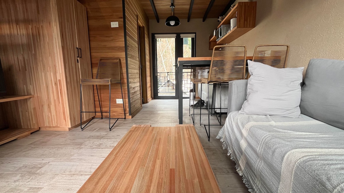 Relájate en este alojamiento bonito, acogedor y tranquilo. Monoambiente nuevo 32 m2, equipado para 2 adultos. Decoración estilo vintage-nórdica. Cochera propia al aire libre dentro del predio cerrado incluida en la estadía. Baño con bañadera con ducha, bidet, inodoro, vanitory. Dormitorio con somier de 2 plazas. Cocina comedor completamente equipada. Mesa, sillas y futón de madera. Textiles Televisor 24" Chromecast. Internet. Frente vidriado con 1 puerta y 1 ventana. Vista al lago y montañas