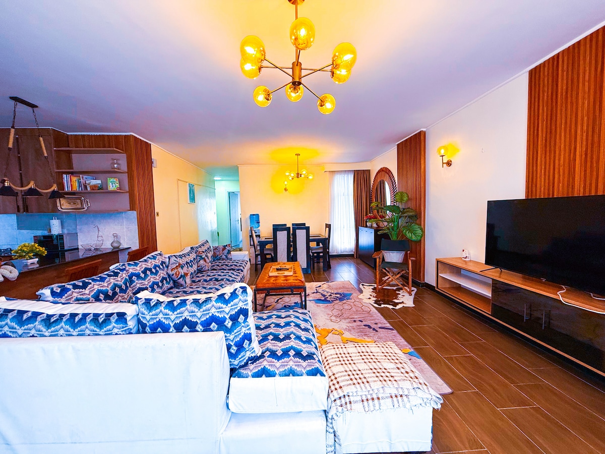 Este es tu lugar de referencia para una estancia auténtica, espaciosa y elegante en un vecindario tranquilo de gran altura rodeado de naturaleza. Disfruta de impresionantes vistas aéreas, aire fresco y un acogedor apartamento amueblado contemporáneo con todas las comodidades modernas en el exclusivo Kileleshwa. El apartamento cuenta con una cocina totalmente equipada y lavandería, elegantes dormitorios con baño y baños relucientes, todos diseñados para brindarte una verdadera sensación hogareña.
