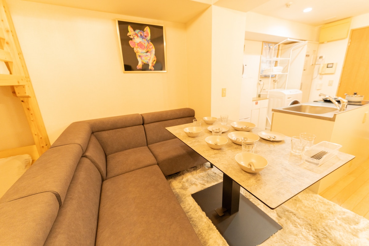 Located in the heart of Sakae, just a 3-minute walk from Yabacho Station. Matsuzakaya Department Store is a 5-minute walk away, and Don Quijote is about 7 minutes away, making the location ideal for shopping, sightseeing, and dining. The room is a compact 32 sqm, furnished with a dining table and sofa for up to 4 adults. A custom-made double-size bunk bed is designed for use by up to 4 adults. A drum-type washer-dryer, separate bathroom and toilet, and TV with Netflix & YouTube are provided.