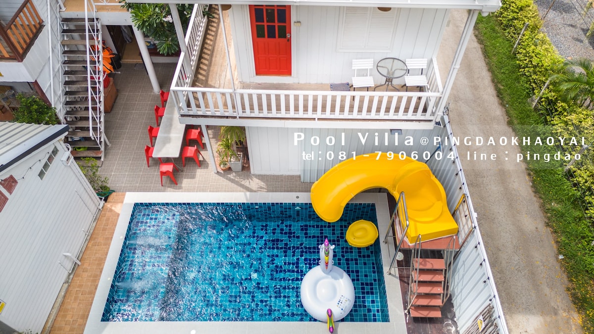 Una suite tipo penthouse de 3 habitaciones en una encantadora casa de estilo Nueva Inglaterra en Khao Yai. Todas las habitaciones incluyen desayuno, una piscina compartida y una ubicación privada y tranquila en Khao Yai. ¡Perfecto para familias y grupos!