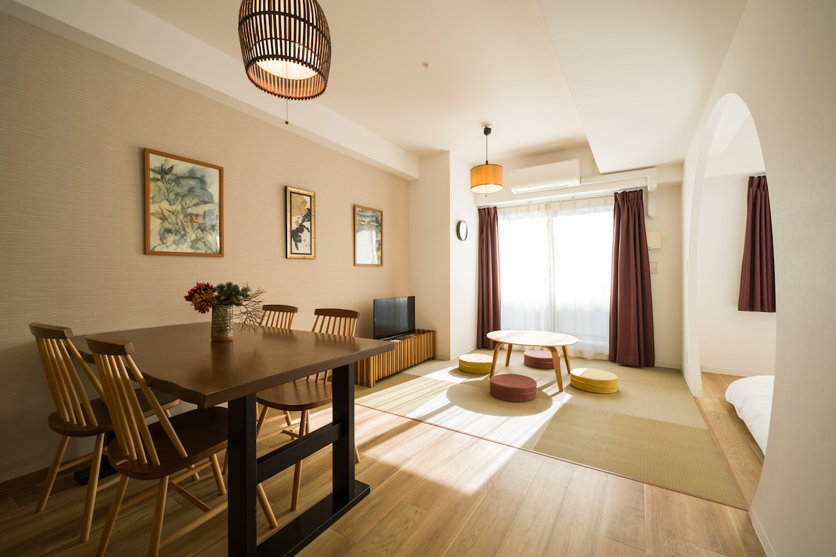 50㎡ Japanese-Style Room for Family or Group ◆Room Features 2 Tatami Bedrooms Separate Kitchen Separate Toilet & Bathroom Accommodates up to 6 guests ◆Excellent Location Only 180 meters from the metro station 6 major rail lines within 500 meters: Subway Midosuji Line Subway Yotsubashi Line JR Lines (30 minutes to Universal Studios Japan) Nankai Lines (45 minutes direct to the airport) Easy Access to Main Attractions Shinsaibashi, Namba, Dotonbori, and Tennoji are all within walking distance