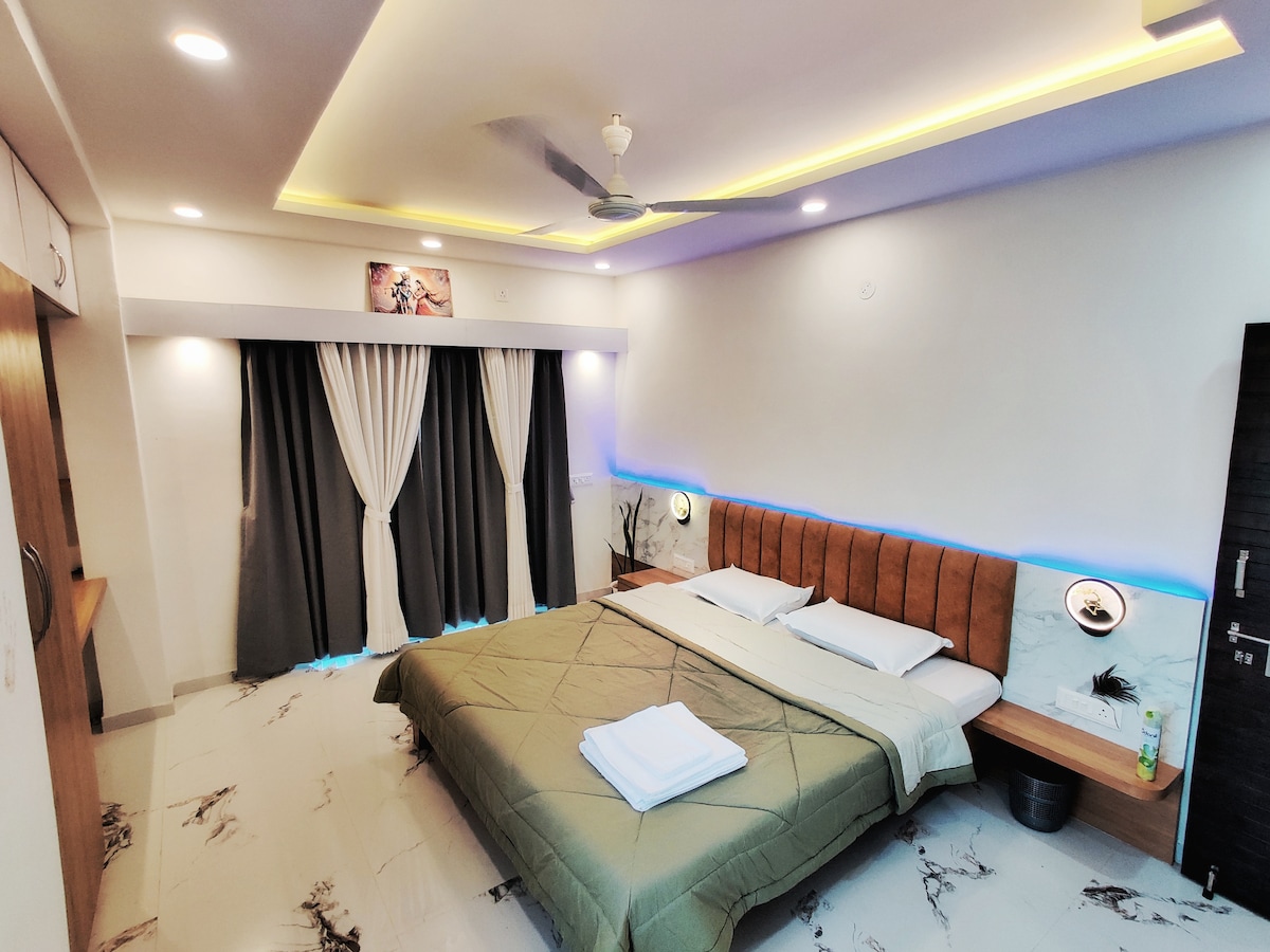 Situado en el suburbio de Mhasrul en Dindori Road, dentro de los límites de la ciudad de Nashik. Efectivamente, solo 899 rupias por persona por noche (8999 rupias/10 personas) Trae a toda la familia o a un grupo de ciervos con mucho espacio para divertirse. El ático cubre todo el cuarto piso, dividido en dos unidades iguales. Puede alojar fácilmente a 10-12 huéspedes con total privacidad en 5 dormitorios separados, mientras que toda la familia puede disfrutar de un gran momento en las dos grandes salas de estar y excelentes vistas desde las paredes de vidrio. Los 5 dormitorios y el pasillo tienen aire acondicionado.