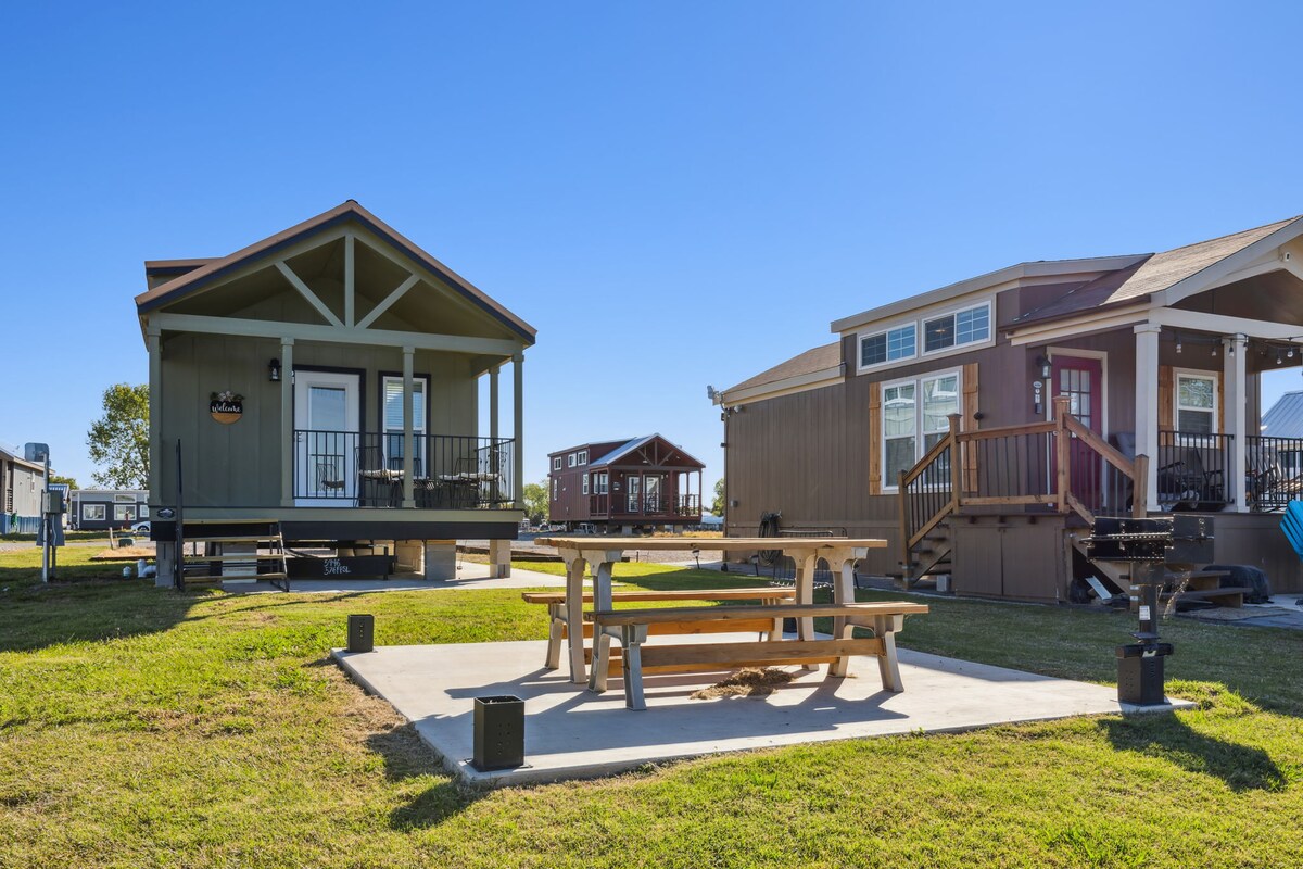 Nuestra minicasa cuenta con todo lo necesario para una escapada FRENTE AL LAGO en Peninsula Point: ¡una minicasa cerrada y un complejo de casas rodantes! Cama tamaño queen en la cama principal, cama doble en el loft para niños + un sofá cama y cama nido para hasta 6 personas Baño de tamaño completo con bañera/ducha de inmersión completa, tocador de tamaño completo e inodoro con cisterna normal Cocina totalmente equipada. El lago está a solo unos pasos de la puerta principal con una terraza, parrilla y fogata con vistas al agua. Camina hasta la piscina, el parque infantil y el parque para perros Minicasas construidas por el río Indigo