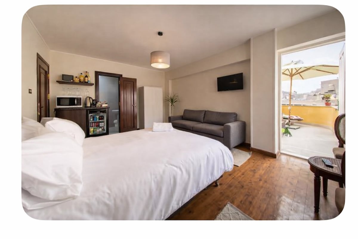 Welcome to a one-of-a-kind retreat just 5 minutes from the Pyramids! This studio offers panoramic Pyramid views and a private hot tub. The space features Pharaonic-inspired design, with unique decor and architectural details that create a historic, cozy ambiance. Enjoy a queen bed, dining area, kitchenette, and private bathroom. Guests also have access to the shared rooftop with stunning views for an unforgettable stay.