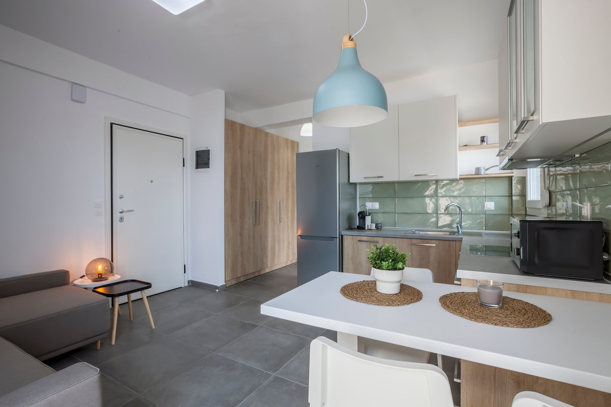 Nuestro espacioso departamento, totalmente renovado, está amueblado con buen gusto y cuenta con servicios modernos, como dos aparatos de aire acondicionado, Internet de fibra óptica, lavadora, lavavajillas y una cocina totalmente equipada para que tu estadía sea cómoda. Lo hemos preparado para que se sienta como un hogar lejos de casa. El dormitorio es independiente para ofrecer mayor privacidad y comodidad. Estás a solo unos pasos de la playa, con fácil acceso a tabernas, restaurantes, cafeterías, tiendas, una parada de autobús, una cancha de tenis y un museo local. Playa: a 1-2 minutos a pie.