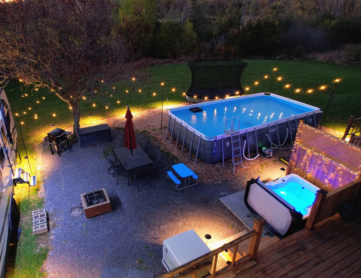 Casa rodante de lujo North Point de 4 estaciones de 5 ruedas en nuestra granja de más de 100 acres cerca de Ottawa. La calefacción controlada por IA mantiene ~22 °C con humedad equilibrada durante todo el invierno Disfruta de fogatas, jacuzzi 24/7/365, piscina de temporada, trampolín, barbacoa de carbón y un sendero privado de pradera a bosque. Ideal para avistar vida silvestre y observar las estrellas ~10 minutos a Almonte (boutiques de Mill St., cafeterías, Riverwalk) A unos 15 minutos de Carleton Place (lago Mississippi, senderos junto al río) ~30 minutos al centro de Ottawa (museos, Parlamento, mercado ByWard)