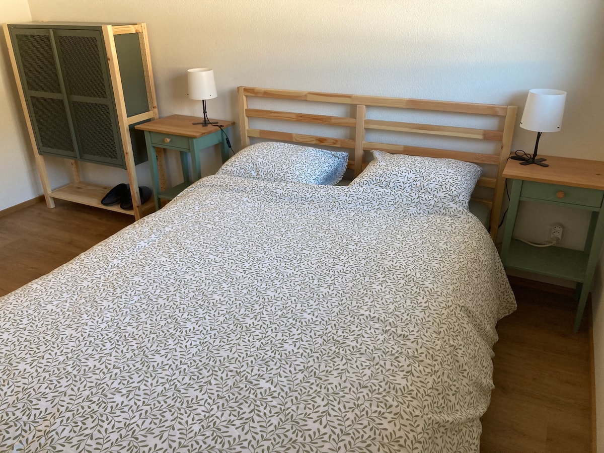 Déjese seducir por este encantador alojamiento tranquilo, con el sol naciente y rodeado de naturaleza. Habitación en la 1.ª planta con vistas al huerto, con cama de 140/200, mesa, sillón y cómoda. Amplio baño privado. Cuna. Cocina compartida disponible solo para comida vegetariana. Comida en el salón o en la terraza cerca del huerto con sus flores. Garaje para bicicletas. Lago a 10 minutos a pie. Parling delante de la puerta. Desayuno no incluido. Dos gatos.